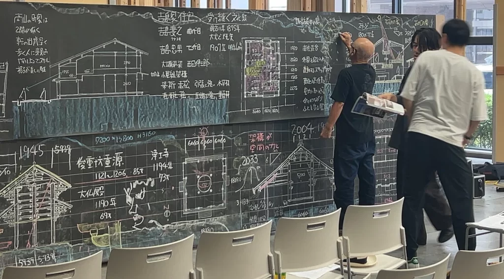 板書が出来上がっていくことで、公演会場の空気感が変わっていくように感じます。1時間掛けて、黒板が図面でギッシリと埋め尽くされていきました。